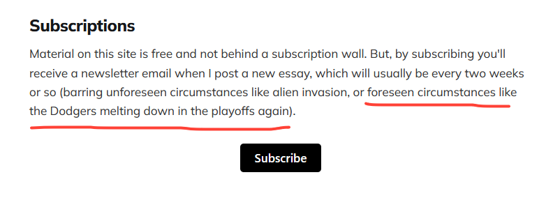 The betting favorites to sign Ohtani right now are the Los Angeles Dodgers, which is the team I have been fated to root for. As of this writing, once again they have won 100 games in the regular season and then faceplanted the first week of the postseason. One of the losingest postseason franchises in American sports, the Dodgers have been defeated in the world series more times than many baseball teams have even made the playoffs. Their losses are so predictable that it would give David Hume pause in his skepticism about regularity and causation (in fact, I anticipated this on my bio page months ago).